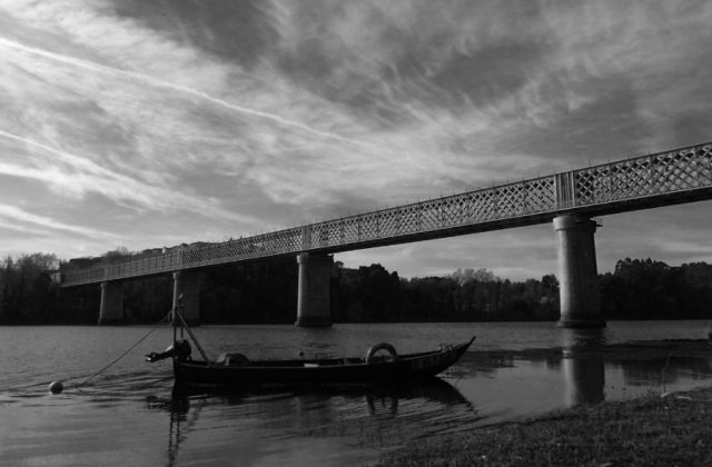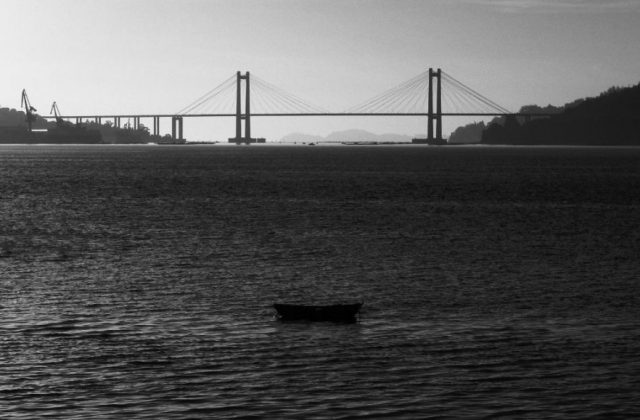Lancha sobrevoada por gaivota en Rande. Carlos